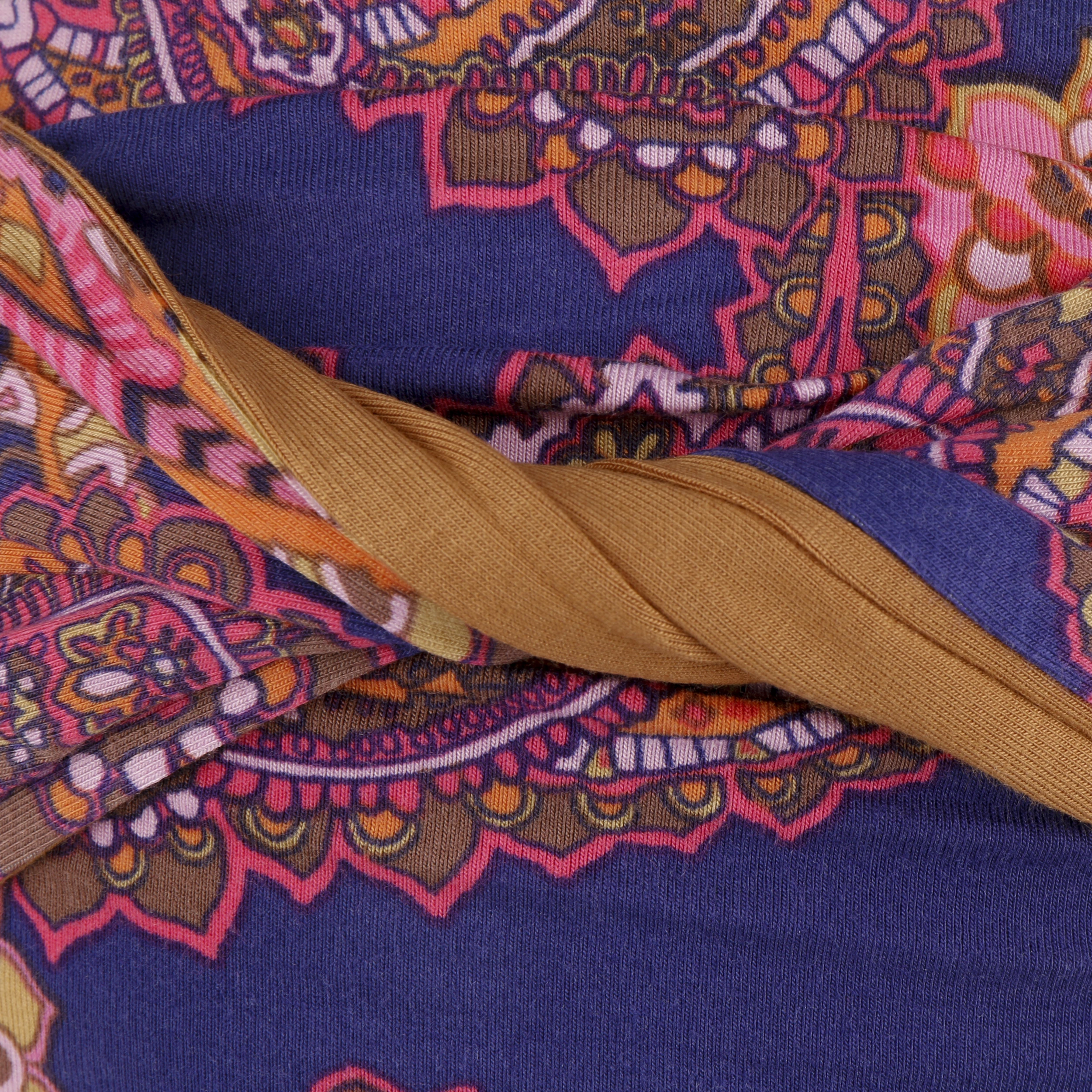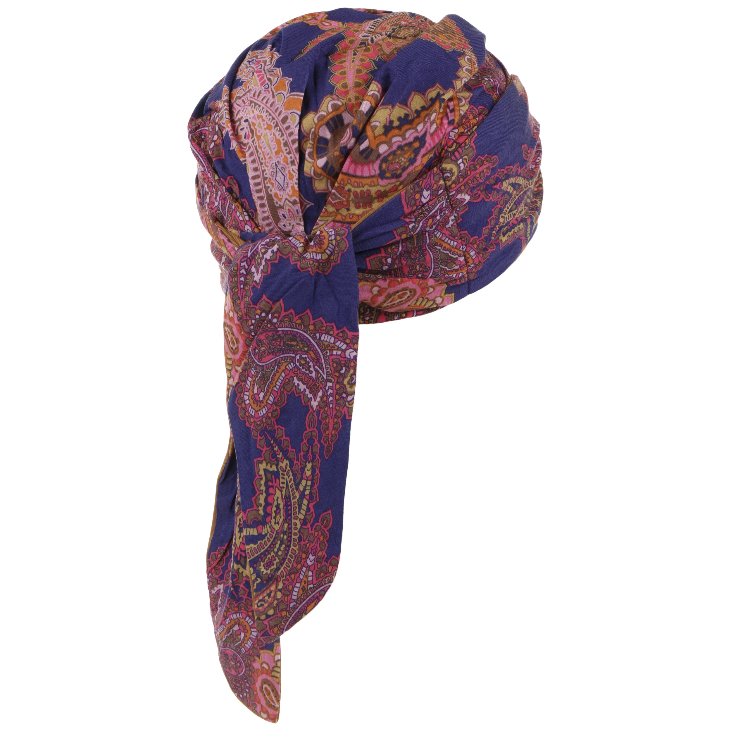 Schick verschlungen und mit ansprechendem farbigen Paisleymuster sowie der hinteren Verlängerung zum Binden bringt der Turban der Marke Christine Headwear kleidsamen Pep auf den Kopf.