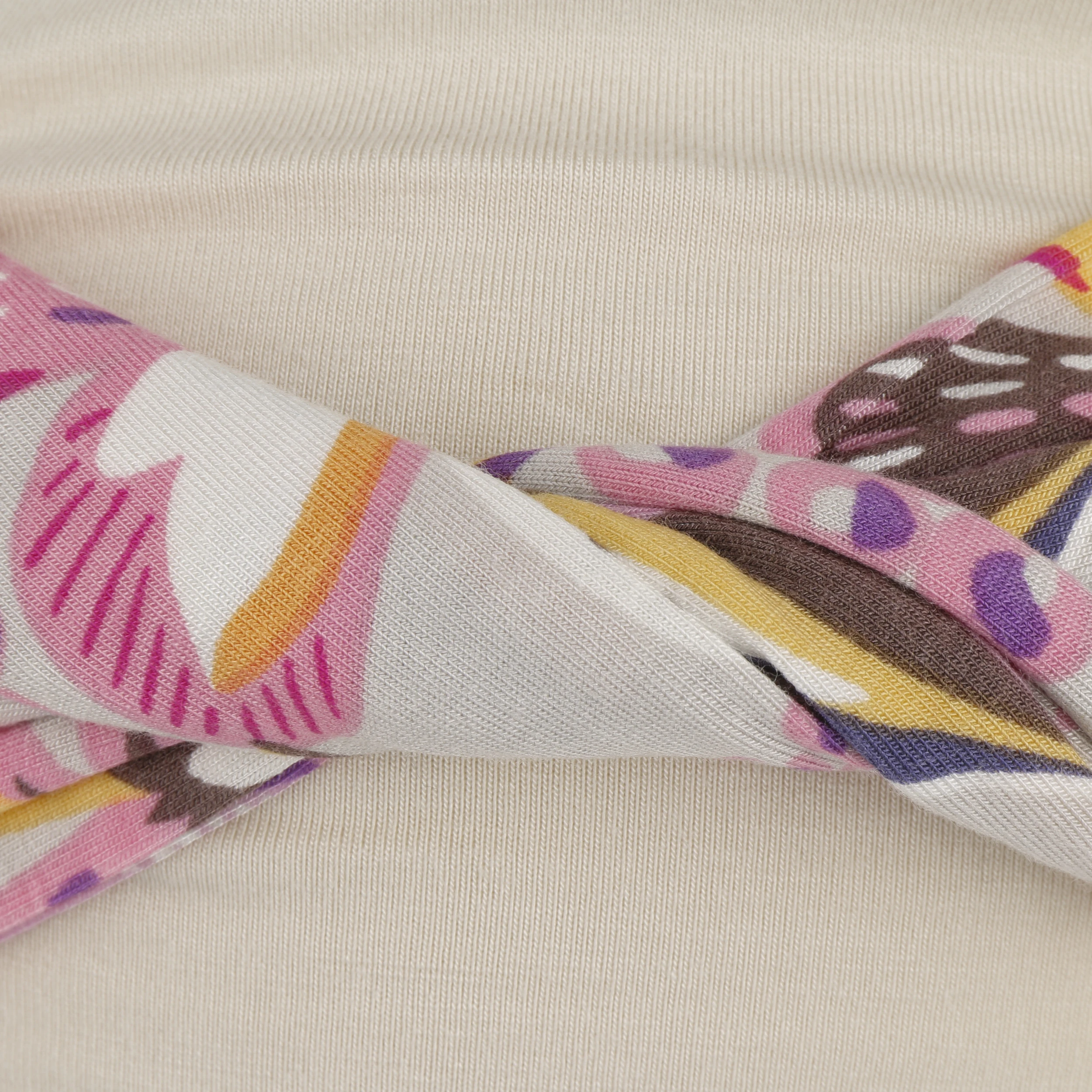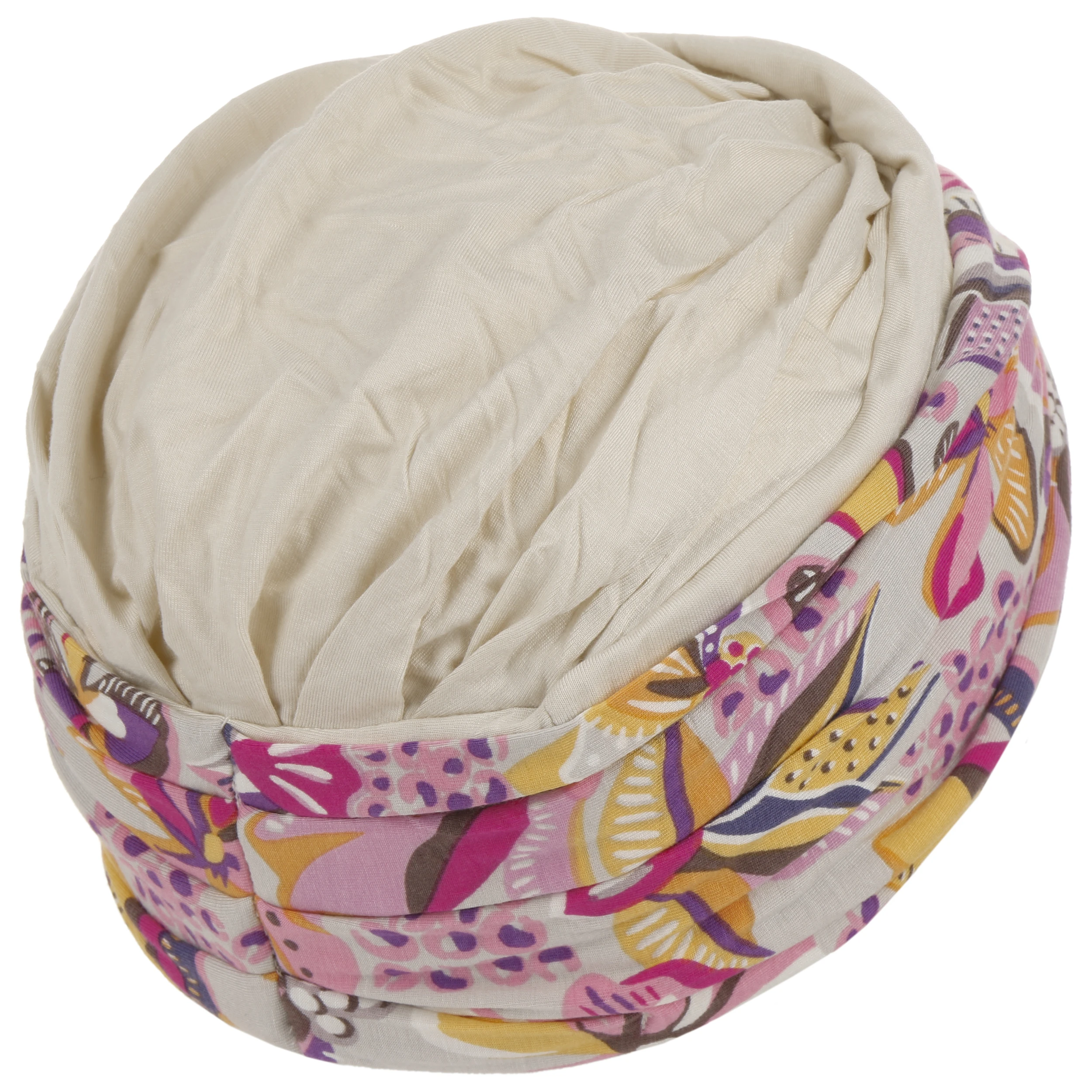 Das angenähte Stirnband mit Blumenmuster im Retrostil macht die unifarbene Kopfbedeckung zum Blickfang. Durch sein farbenfrohes Design und das elegant drapierte Band setzt das textile Accessoires modische Akzente zu sommerlich leichten Outfits. Der stilvolle Turban passt hervorragend zu Kleidung in hellen Natur- und Pastelltönen.
