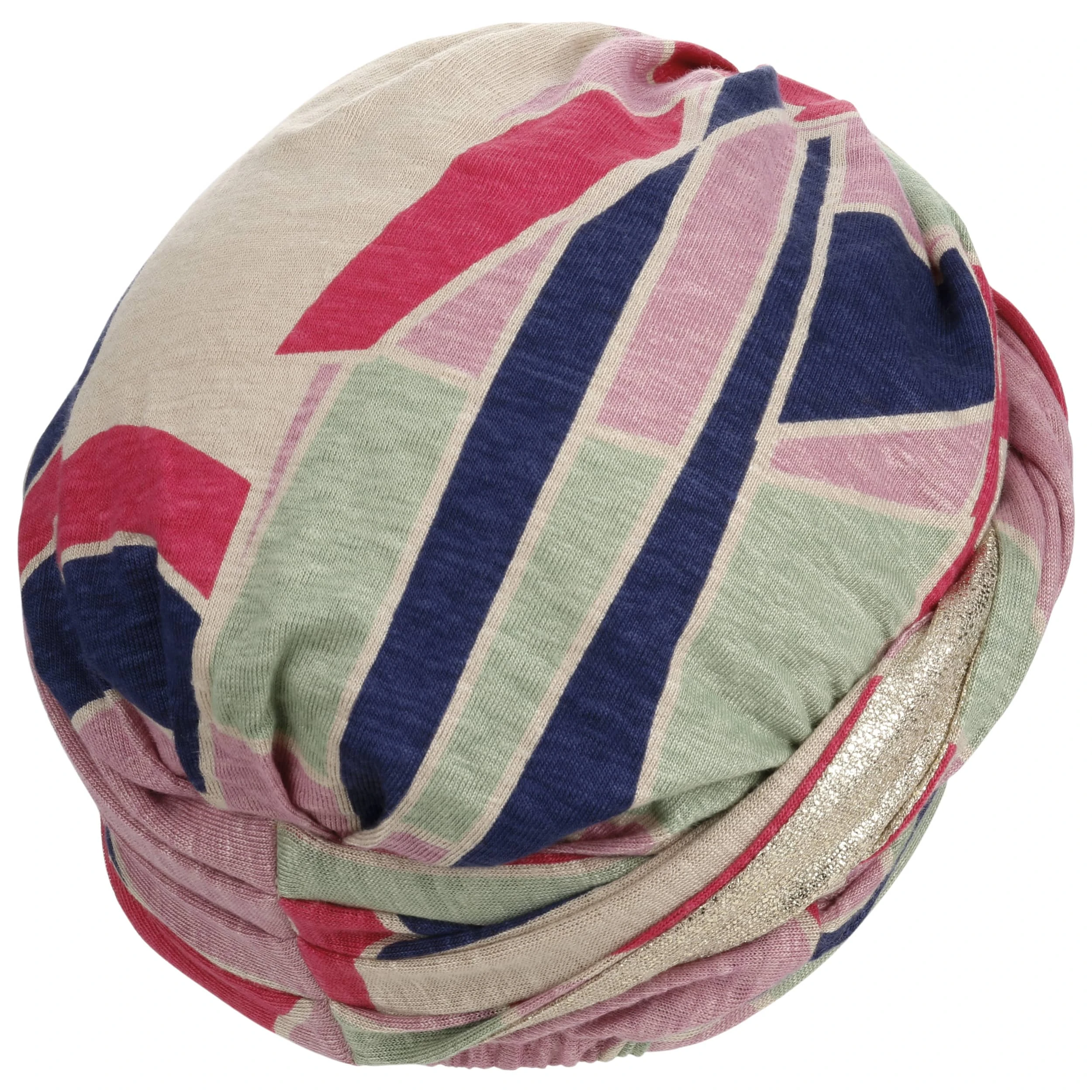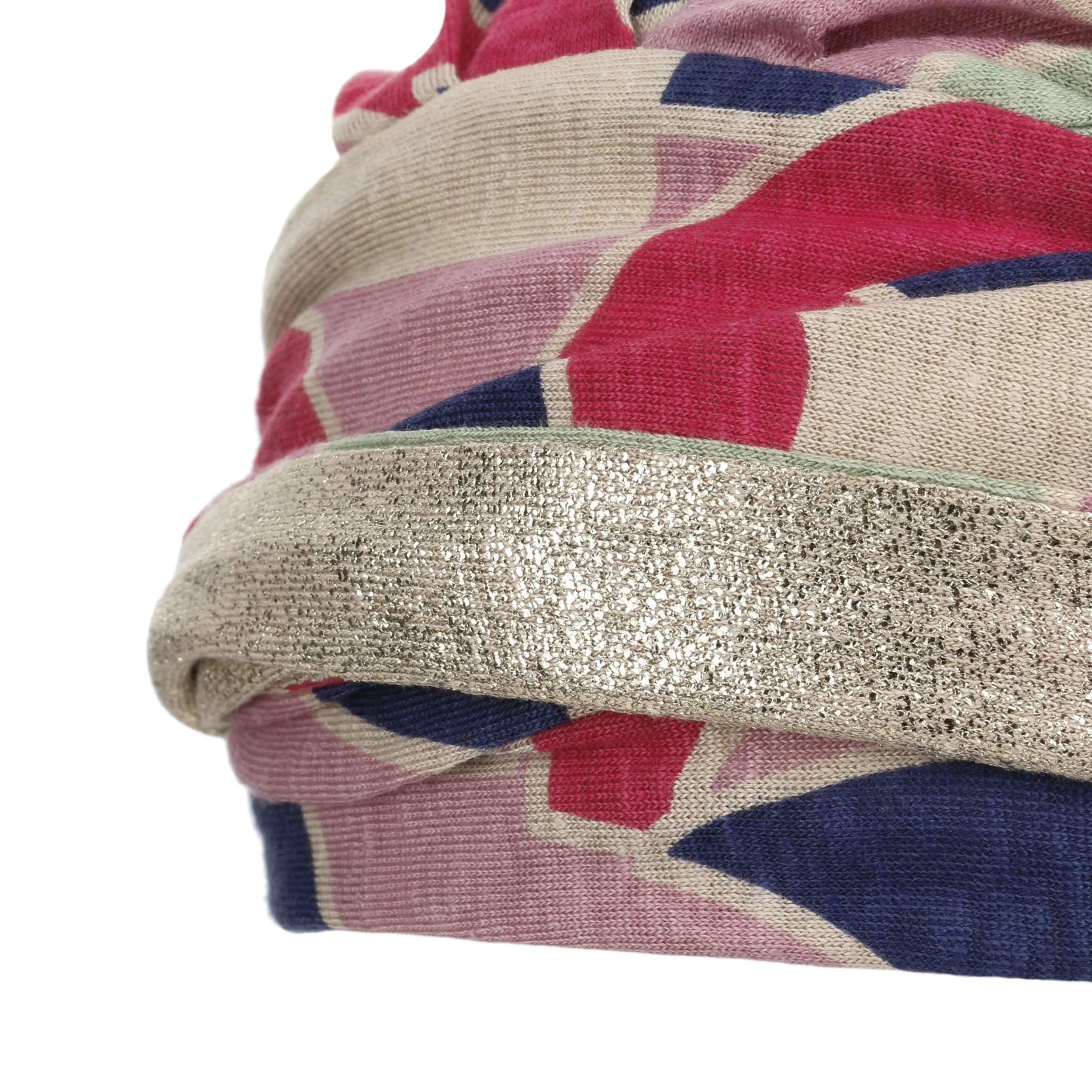 Durch die Beimischung von Elasthan erhält das bindbare OEKO-TEX®-Kopftuch seine Geschmeidigkeit und Flexibilität. Der gemusterte Stoff schmiegt sich sanft an den Kopf und schützt ihn vor Kälte und Sonne. Ein golden glitzernder Streifen verleiht dem Look einen Hauch von Glamour.