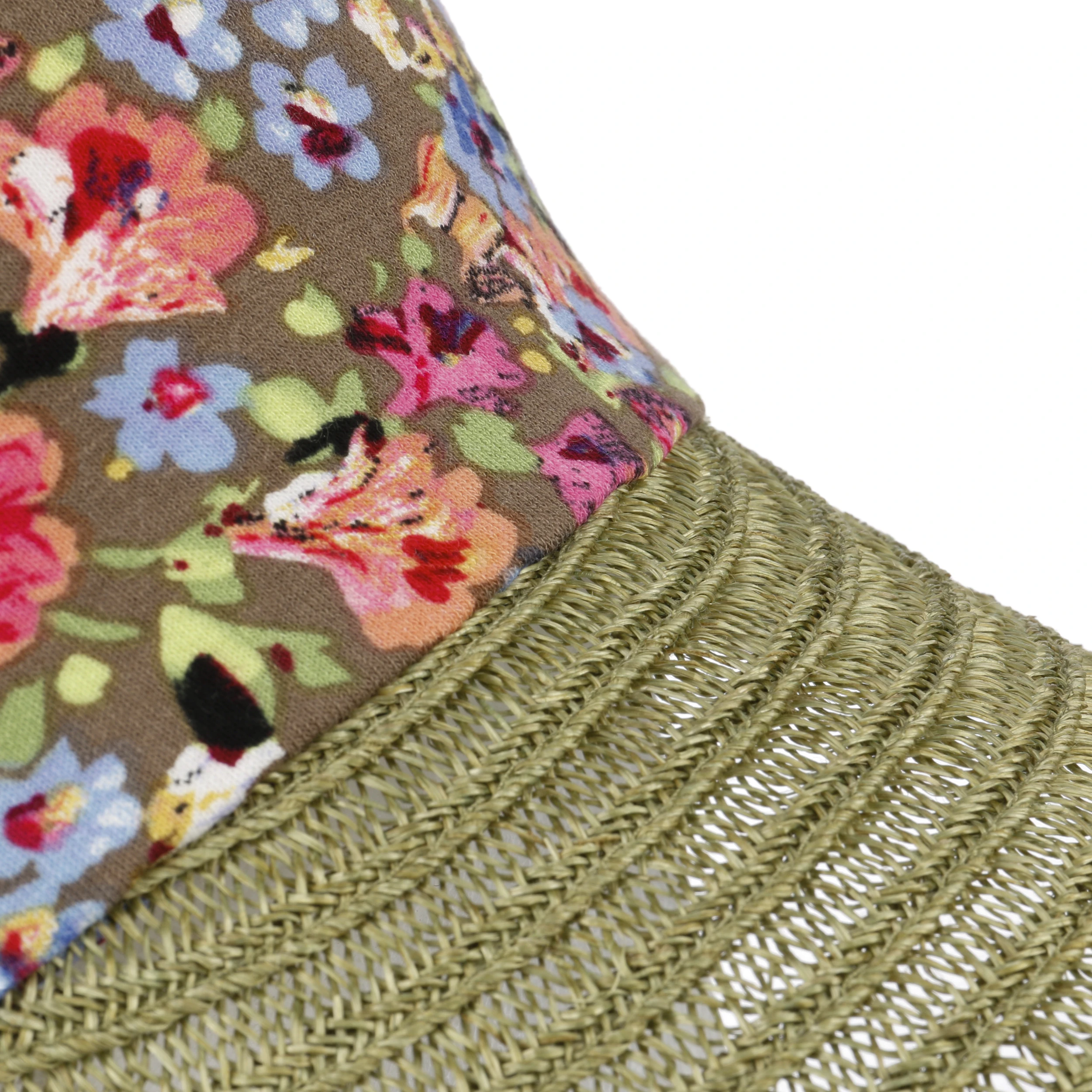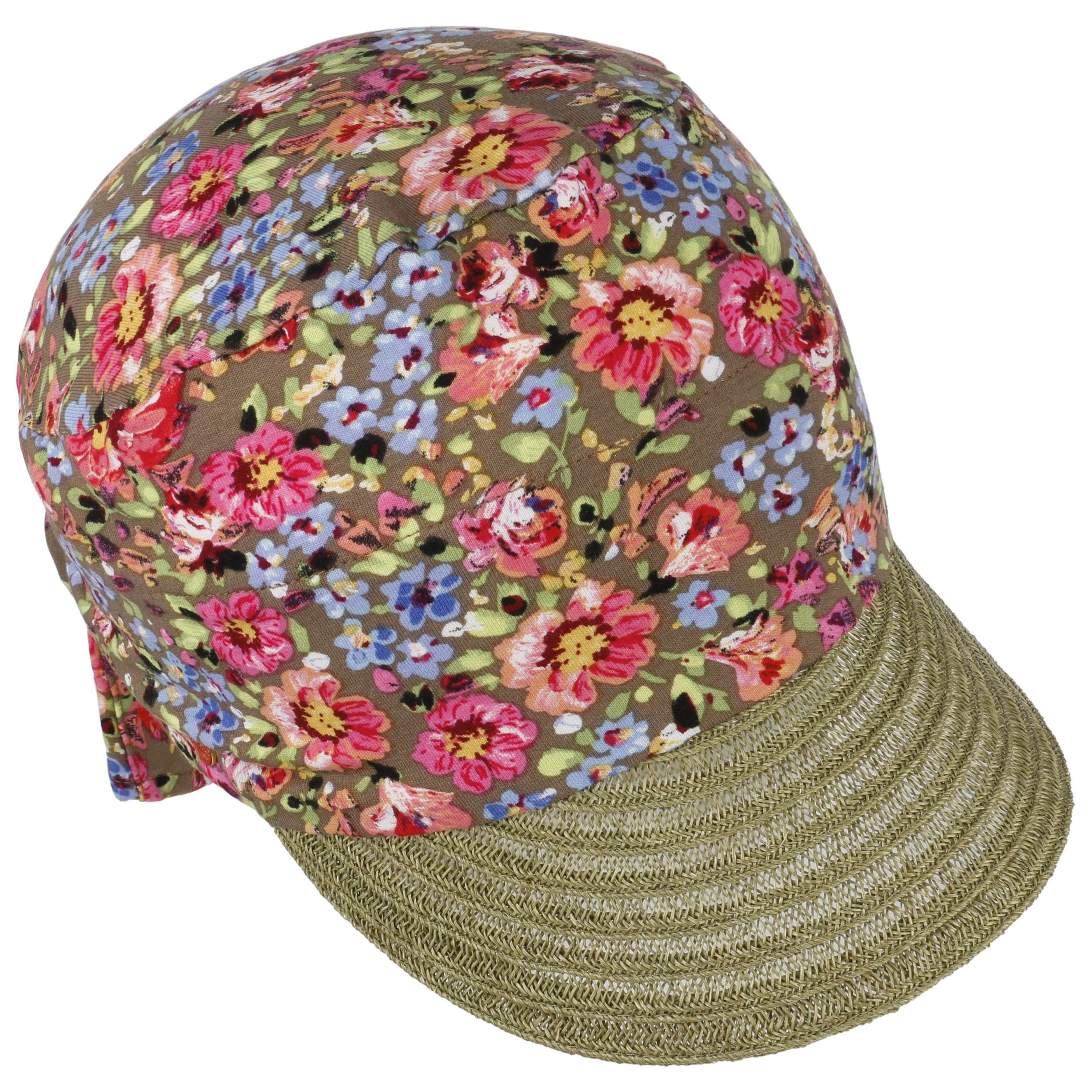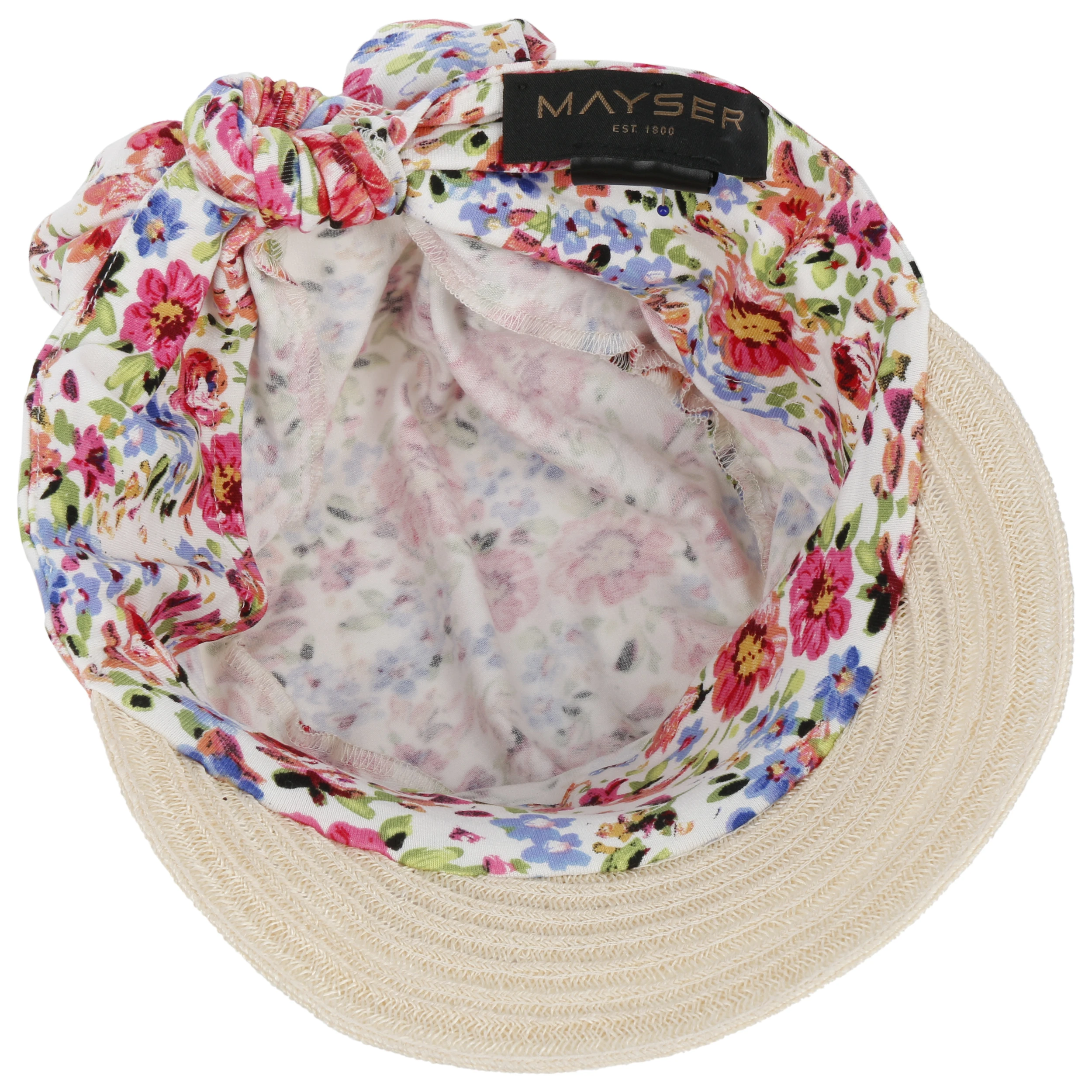 Der dekorativ geflochtene Schirm ist zu zwei Dritteln aus Hanf gefertigt und schützt vor Sonne und aufdringlichen Paparazzi. Das bunt geblümte Viskosetuch schmiegt sich dank einem kleinen Anteil Elastan angenehm an. Mit der Schleife lässt sich der Visor individuell an die Kopfgröße anpassen.