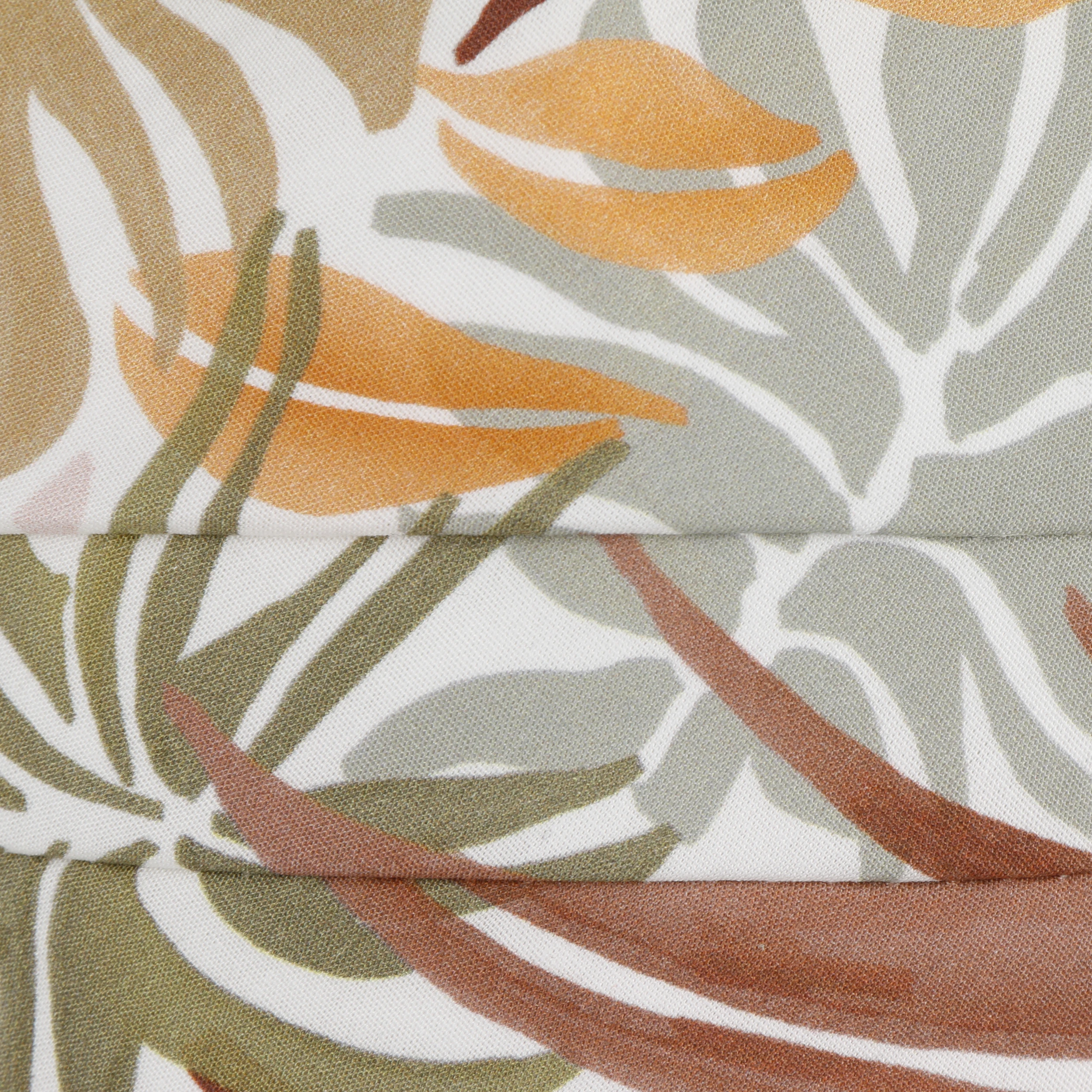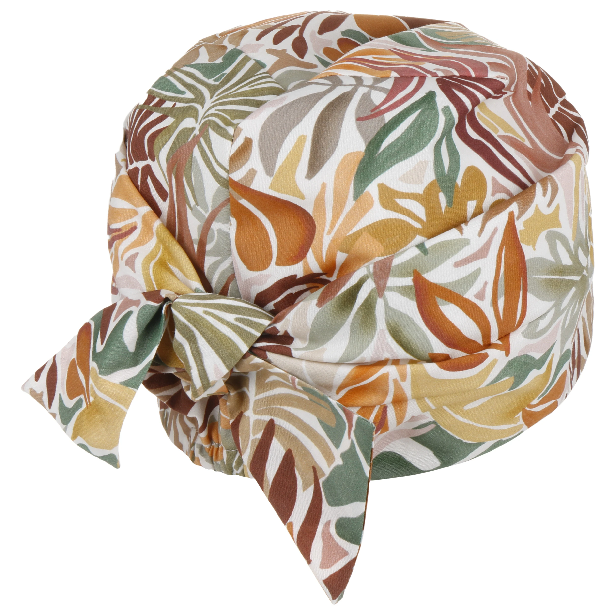 Der Druck, der sich über das gesamte Textil erstreckt, zeigt charakteristische Silhouetten unterschiedlicher Pflanzenblätter. Details wie die Schleife, die die Rückseite der aus 100% Baumwolle gefertigten Kopfbedeckung ziert, verleihen dem Design einen ansprechenden femininen Charme.