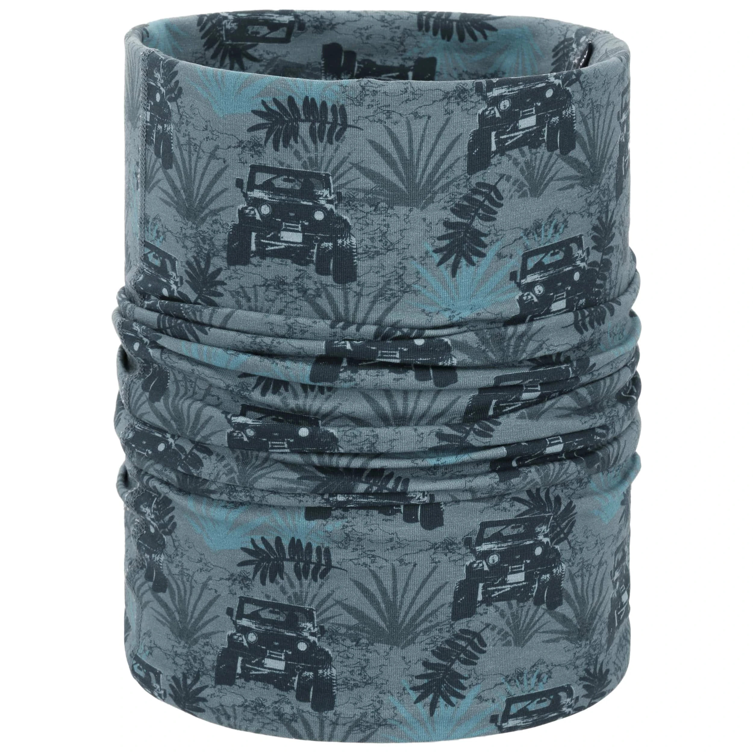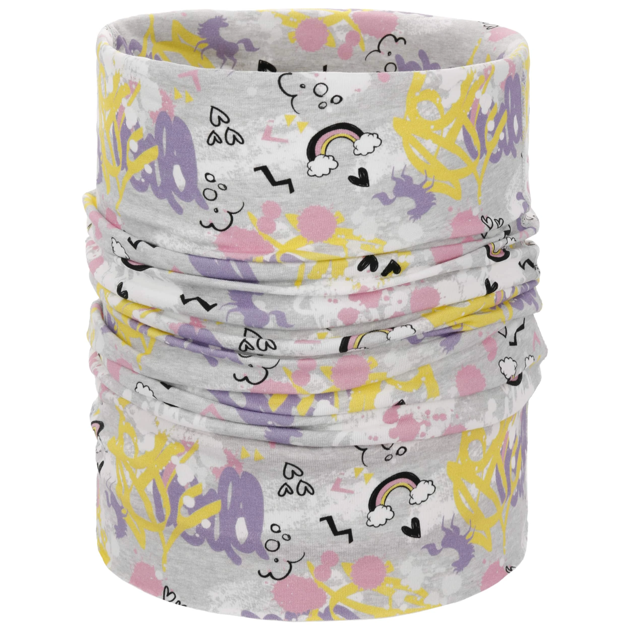 Geht es nach draußen, lässt sich das wandelbare Multifunktionstuch auch wie eine Mütze über Kopf und Ohren ziehen und mit einem schicken Knoten zusammenbinden. Kinder lieben das fröhliche Muster in modischen Farben.