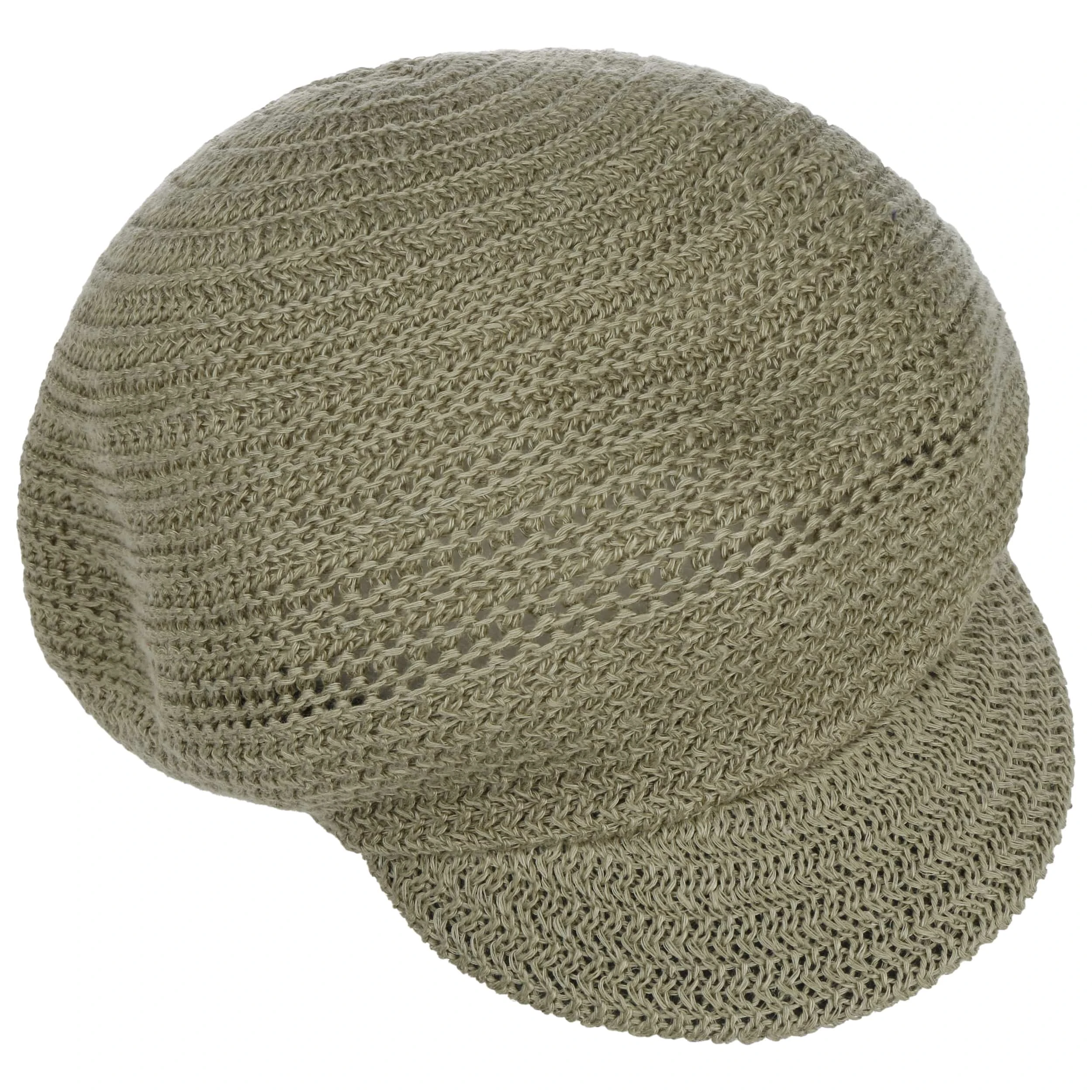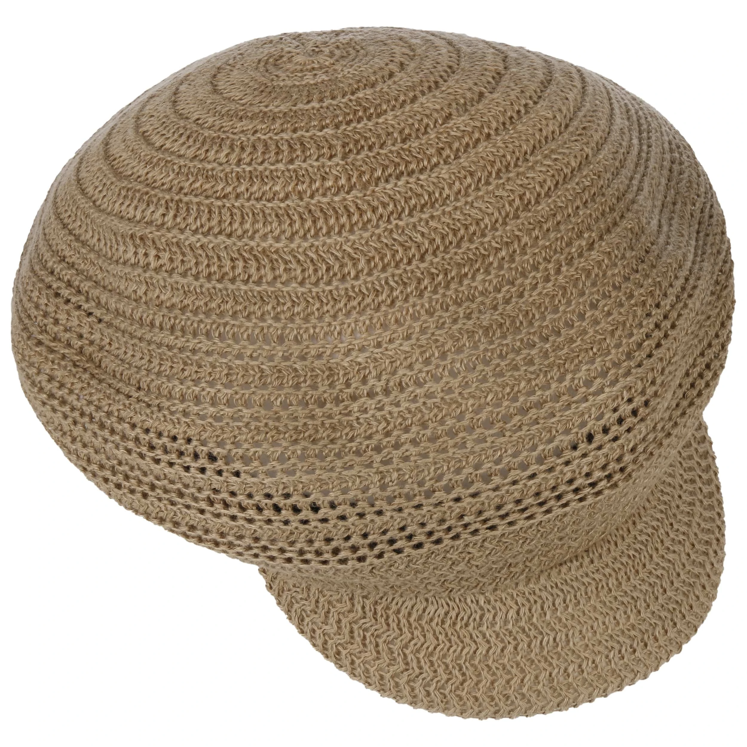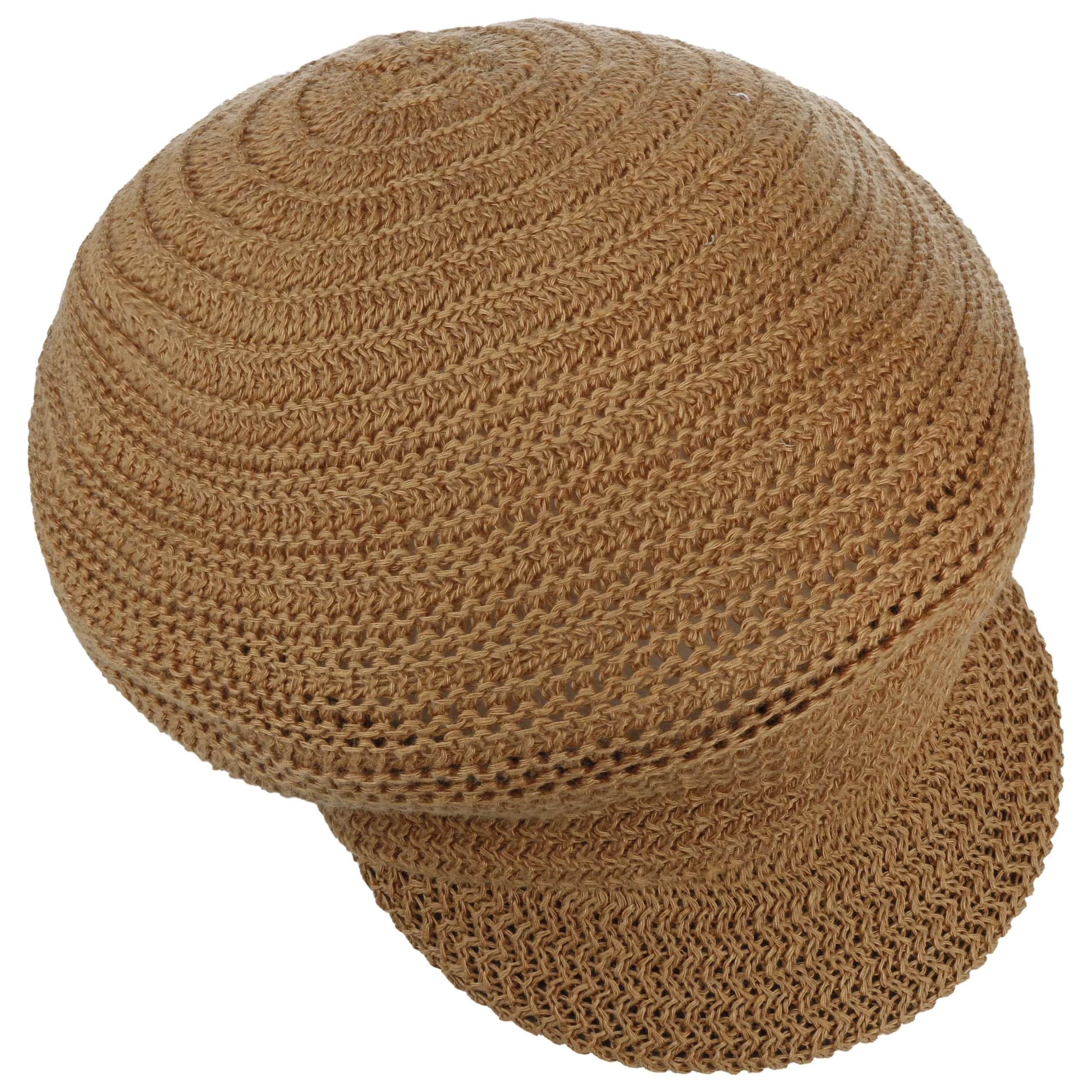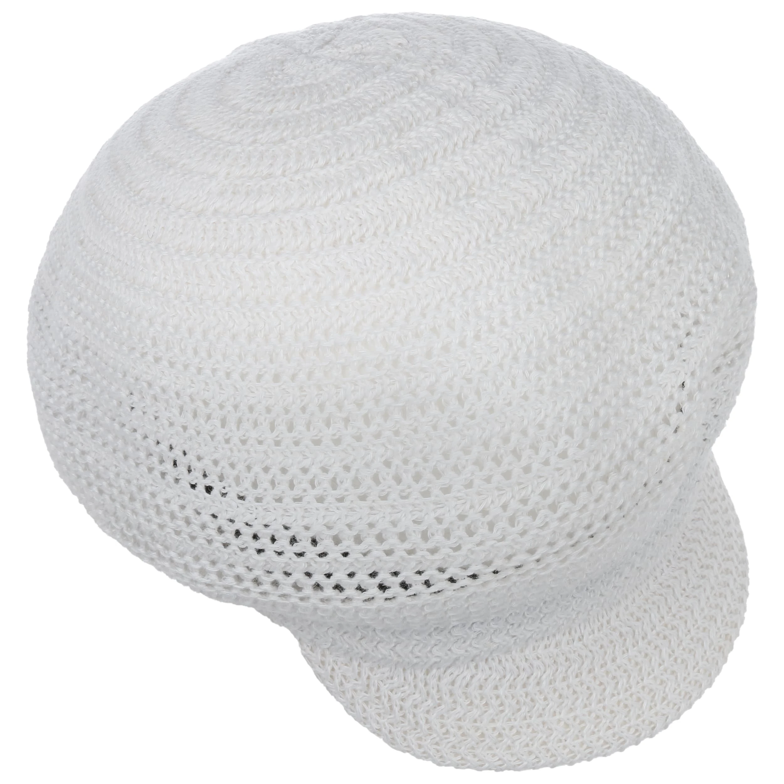 Luftige Maschen mit Zickzack-Dynamik ringeln sich um den luftigen Schirm der unifarbigen Ballonmütze und machen sie zum charmanten Topping eines lässigen Sommeroutfits.